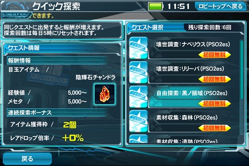 (1) 「クイック探索」へ出発するには、『PSO2』と連動する必要があります。
