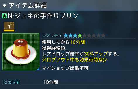 使用してから10分間 獲得経験値、レアドロップ倍率が30%アップします。